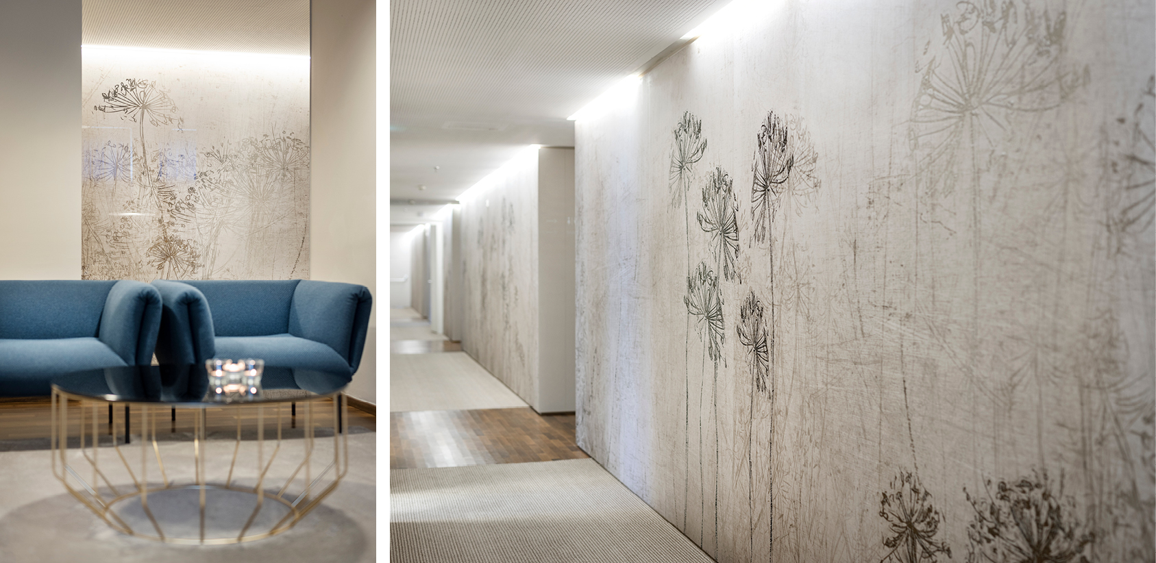 Ein zentraler Erschließungsgang bildet die Hauptachse des Gesundheitszentrums, von der sich das Raumprogramm auf beiden Seiten entfaltet. Der langgestreckte Flur zweigt in die verschiedenen Bereiche - Rezeption, Ordination, Ruhezonen sowie Massage- und Behandlungsräume. Durch die gezielte Verwendung unterschiedlicher Bodenbeläge wird das schlauchförmige Volumen gegliedert und in kleinere funktionale Einheiten unterteilt. Entwurfsbestimmendes Element ist die Tapete mit ihrem abstrahierten Wiesenmotiv, das einen direkten Bezug zur umliegenden Landschaft der Heiltherme Loipersdorf herstellt. Die Oberflächen sind bewusst in reduzierten, hellen Tönen gehalten, um eine Atmosphäre der Ruhe und Erholung zu fördern. In diese ruhige Grundstimmung sind blaue Möbel und Textilien eingestreut, um die Corporate Color der Merkur Versicherung subtil in die Räumlichkeiten einzuflechten.